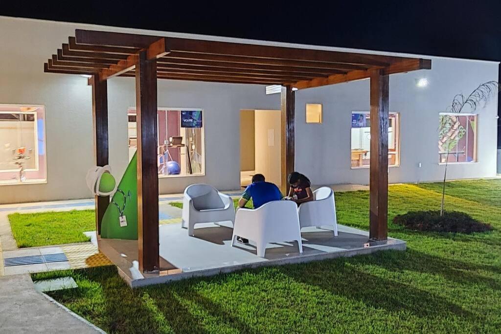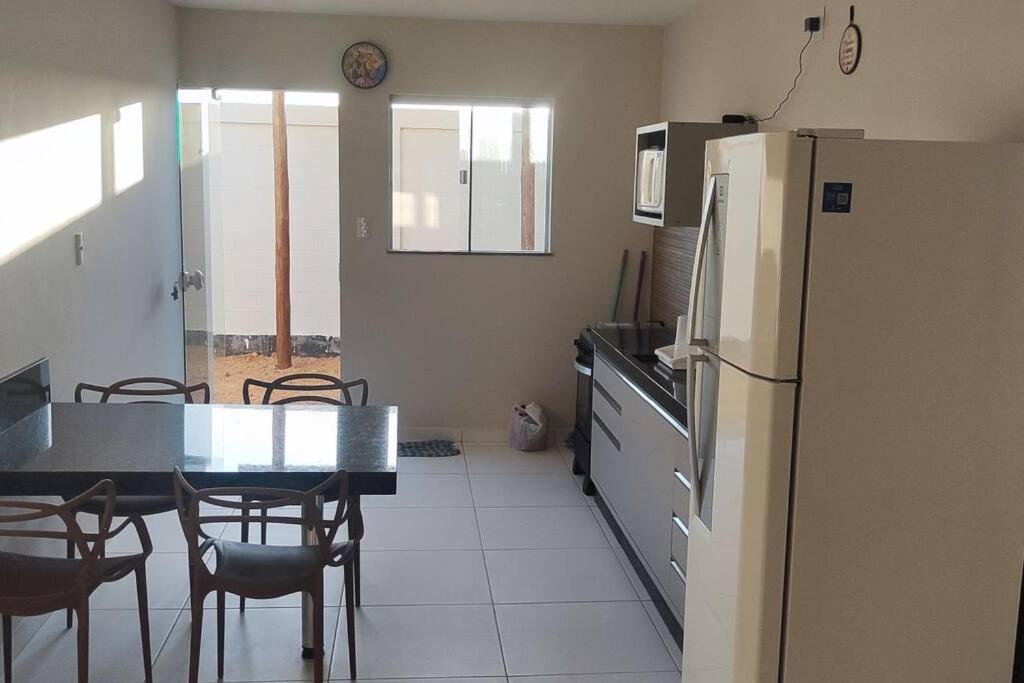 Casa com 2 Quartos. The kitchen features a stovetop, kitchenware and an oven. The air-conditioned holiday home features a flat-screen TV, a wardrobe, a sofa, a tiled floor as well as garden views. The unit has 3 beds.
