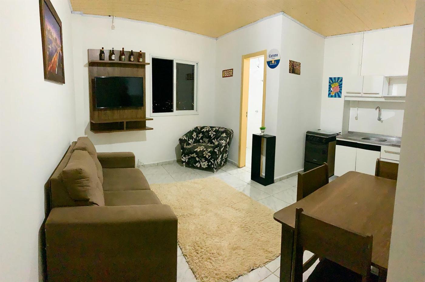 Apartamento com 1 Quarto. The apartment has 1 bedroom, 1 bathroom, a kitchen and a dining area. The apartments kitchen, which features kitchenware and an oven, is available for cooking and storing food. This apartment features a flat-screen TV. The unit has 2 beds.