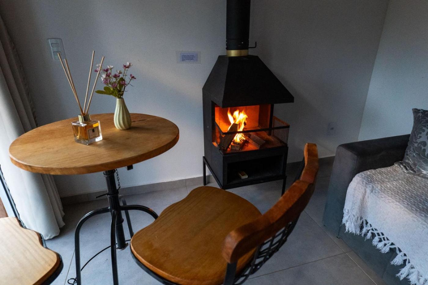 Quarto Triplo com Vista Montanha. This triple room features a fireplace. A kitchenette fitted with kitchenware, a microwave and a tea and coffee maker is available for cooking and storing food. This triple room is comprised of a flat-screen TV with streaming services, a private bathroom as well as a balcony with mountain views. The unit has 1 bed.