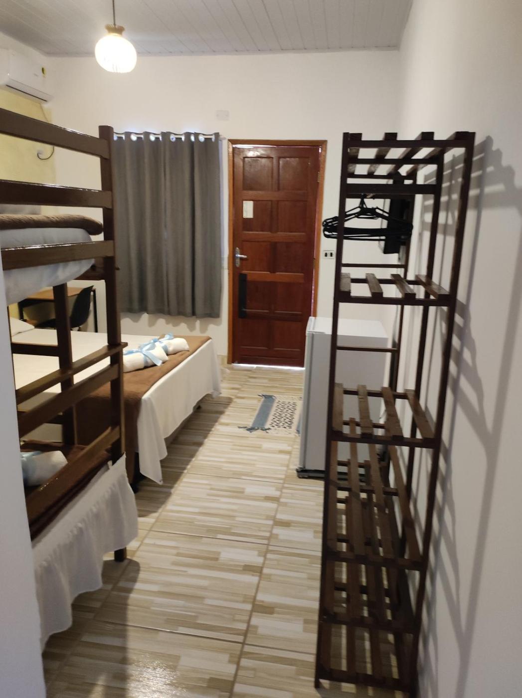 Dormitório Feminino com 6 Camas. The dormitory room includes a shared bathroom equipped with a shower. The unit offers 3 beds. ;