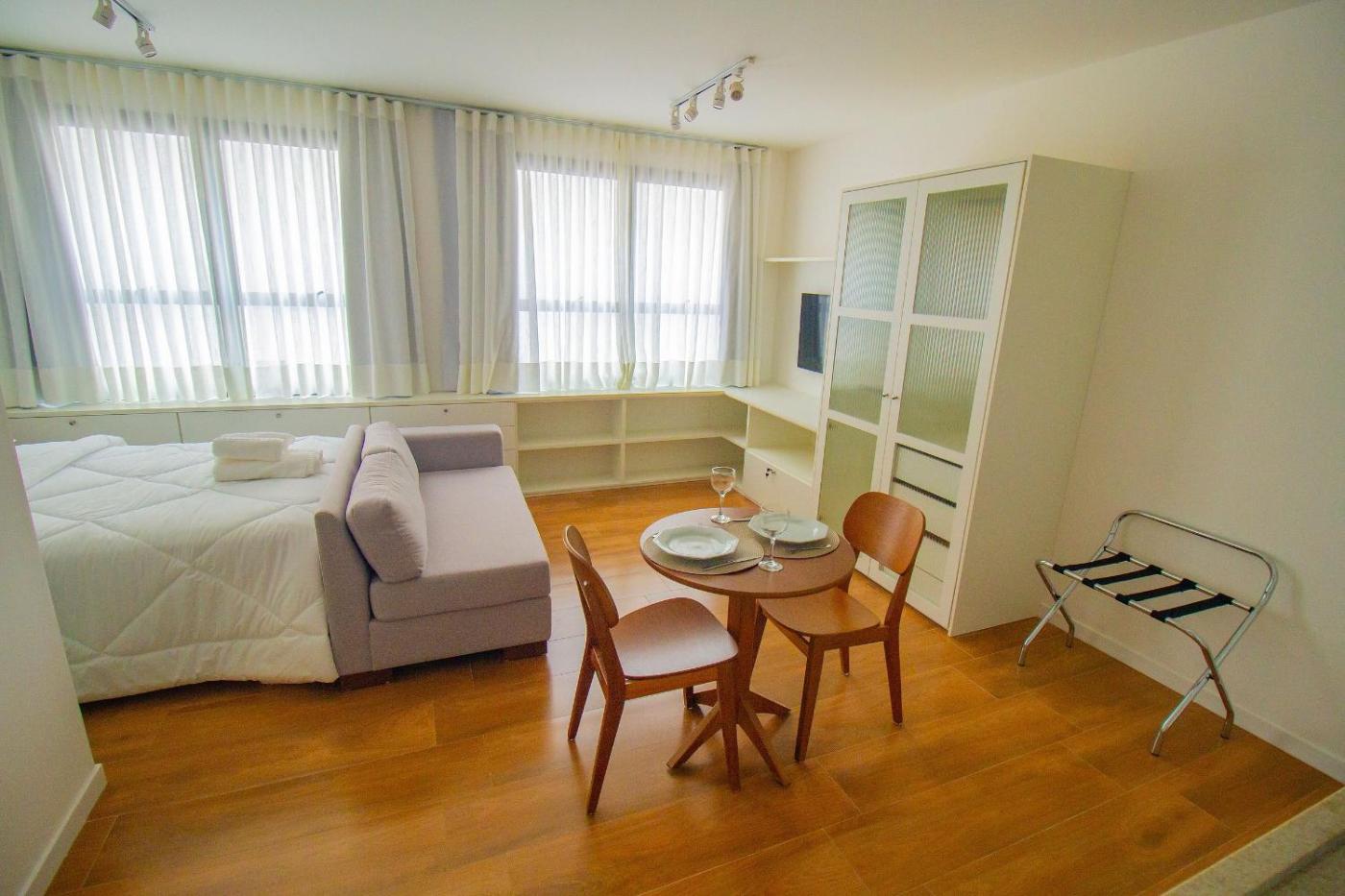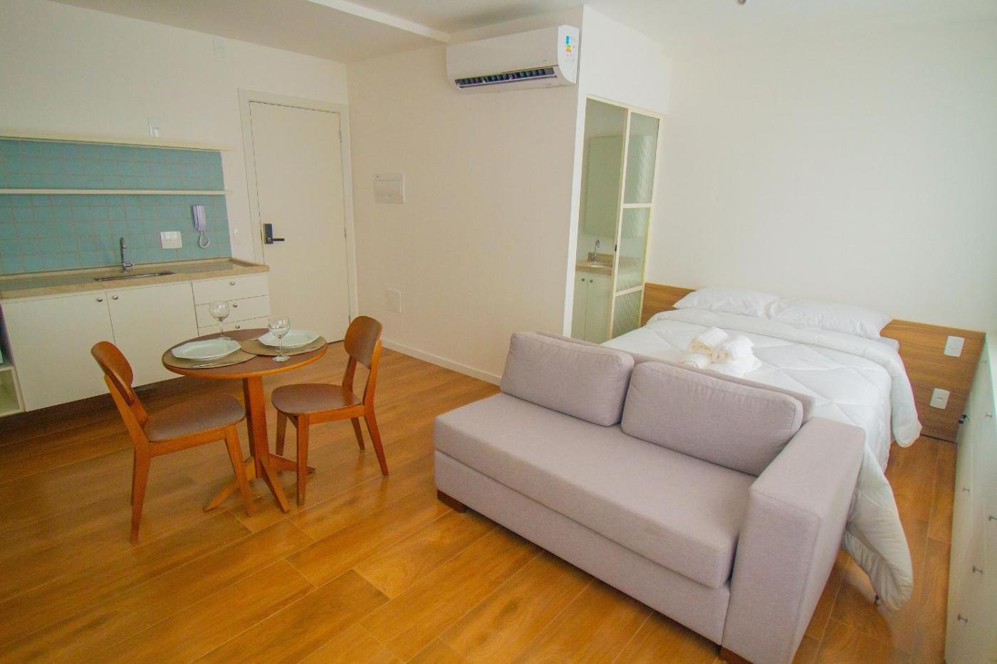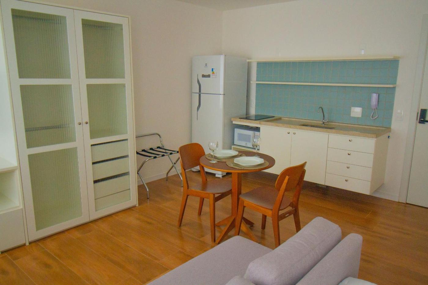 Apartamento com Varanda. The air-conditioned apartment has 1 bedroom, 1 bathroom with a hairdryer and a kitchen. Guests will find a stovetop, a refrigerator, kitchenware and a microwave in the well-fitted kitchen. The apartment also includes a barbecue. The apartment is furnished with a desk and a seating area and features a dining area and a wardrobe. The unit has 1 bed. ;