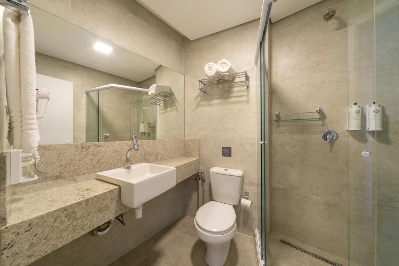 Quarto Duplo Deluxe com Varanda. Featuring free toiletries, this double room includes a private bathroom with a shower and a hairdryer. The air-conditioned double room features a flat-screen TV with streaming services, soundproof walls, a minibar, a wardrobe as well as city views. The unit has 1 bed. ;